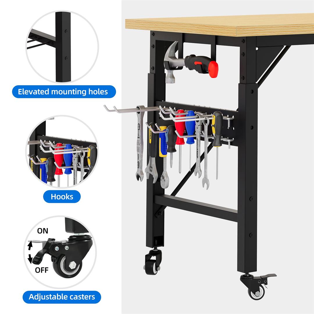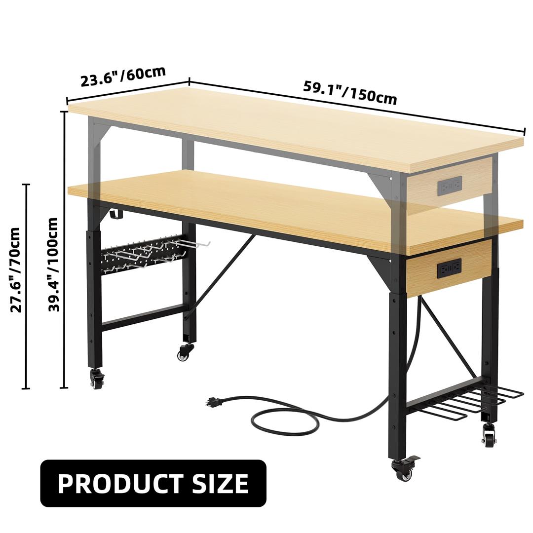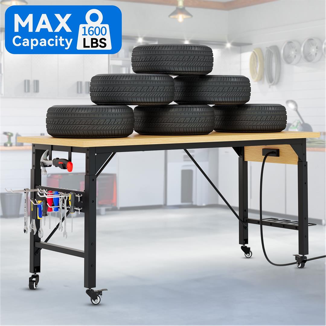 Transform your workspace with the 60″ Adjustable Workbench on Wheels, designed for ultimate versatility and convenience. Featuring a height range from 27.6″ to 39.4″, this workbench adapts perfectly to various tasks, be it studying, crafting, or handling heavy machinery. The integrated charging hub includes 2 USB and 2 AC outlets, ensuring your devices remain powered without the clutter of extra cords. With its premium hardwood top supporting up to 1600 lbs, this durable workbench provides unmatched stability for all your projects. Ample storage options, including sturdy metal hooks and shelves, keep your tools organized and within easy reach. Four wheels offer effortless mobility, making it simple to move your workstation as needed, whether in your garage, workshop, office, or outdoors.