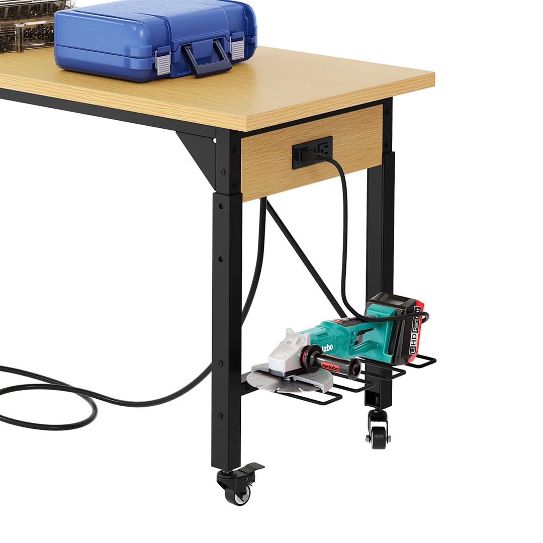 Offers an extensive height adjustment range between 27.6″ to 39.4″, allowing users to tailor the workbench to their specific needs for comfort and efficiency. Constructed from premium hardwood, this workbench supports up to 2000 lbs, delivering exceptional durability and stability even when handling heavy loads. Comes equipped with a built-in charging station featuring 2 USB and 2 AC outlets, enabling seamless device charging and eliminating the need for additional power sources. Sturdy metal hooks and shelves provide smart tool organization, keeping your workspace tidy and ensuring that all your tools are easily accessible and neatly arranged. Includes four wheels for easy movement around your workspace, offering unmatched flexibility and convenience for dynamic working environments.