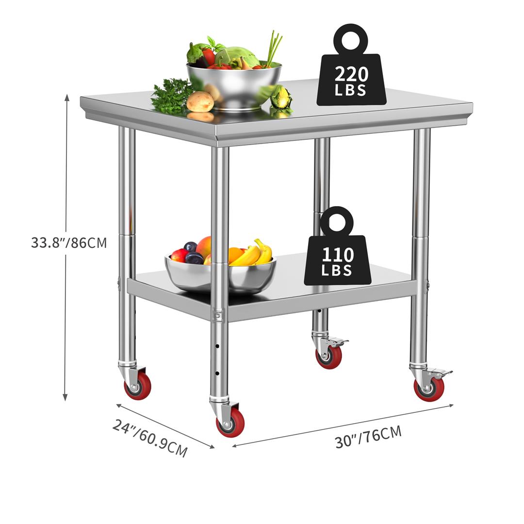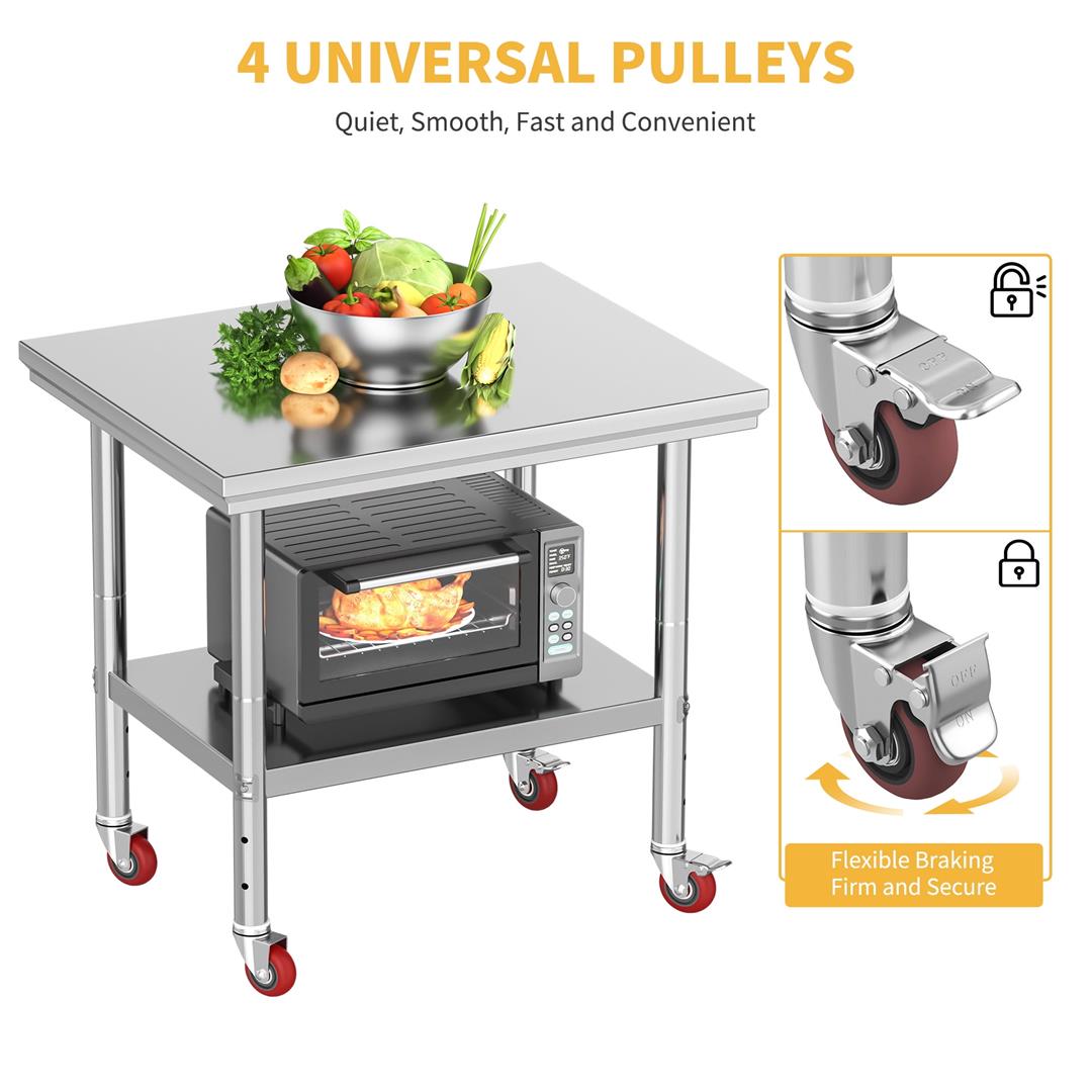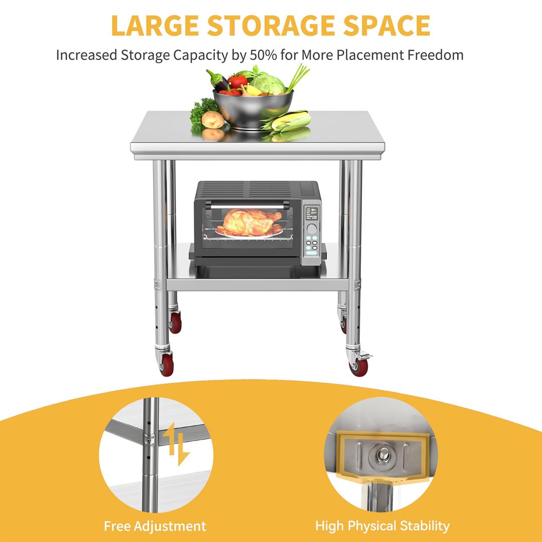 NSF-Certified: Perfect for kitchens, restaurants, garages, and more as a prep table, workbench, or storage station. Adjustable 2-Tier Storage: Spacious stainless steel shelves with a customizable lower shelf for larger appliances. Secure Mobility: 360 swivel wheels for easy movement, with two lockable wheels for stability. Heavy-Duty and Rust-Resistant: 201 stainless steel construction supports 330 lbs, ensuring durability and easy cleaning. Quick Assembly: Includes tools, instructions, and gloves for fast, hassle-free setup.