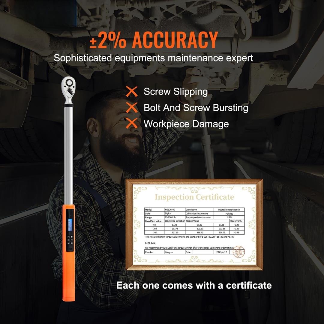 Product Description 1/2″ Digital Torque Wrench Are you concerned about over-tightening or under-tightening bolts and causing damage to your instruments or equipment? Look no further than VEVOR’s high-precision digital torque wrench! With an accuracy up to 2%, this torque wrench tool is ideal for repairing precision and valuable instruments, as well as automobiles. Constructed from heat-treated chrome vanadium steel, this torqur wrench is capable of providing tens of thousands of uses, making it an invaluable asset for high-end repairs. 2% High Precision The preset torque accuracy of 2% meets the demands of precision instruments and high-end automotive maintenance. Featuring a 72-tooth ratchet, this torque wrench kit boasts military-grade quality. Military-Grade Quality The wrench is constructed with attention to detail. The surface undergoes a chrome-plating process, creating a mirror-like finish that is resistant to rust and corrosion and easy to clean. Interior durable and robust chrome vanadium steel material provides long-lasting performance. Three Modes of Operation With real-time mode, peak mode and preset memory mode, you can quickly switch modes according to your usage habits, to achieve accurate and efficient work. No Over-torque When the set torque value is reached, the wrench will emit an LED indicator , vibration and sound to remind you to stop applying force, avoiding over-torque damage to your items. Efficient Disassembly and Assembly The tool enables one-click disassembly and assembly of the socket, making it possible to operate single-handedly. This feature saves time and effort, making work more efficient and streamlined. 72-Tooth Ratchet With a 72-tooth ratchet, this tool requires only a 5-degree rotation angle per turn, making it highly flexible and convenient to use. It can operate smoothly even in confined spaces, and its hardness provides superior durability. Specifications Item Model Number: 12250FTLB Torque Range: 25-250 ft.lb / 34-340 n.m Drive Size: 1/2 inch Ratchet Teeth: 72 Accuracy: Clockwise/Counterclockwise 2% Net Weight: 6 lbs / 2.7 kg Product Size: 25.6 1.4 1.3 in / 65 3.5 3.4 cm Package Size: 26.8 6 3.1 in / 68 15 8 cm Package Content 1 x Torque Wrench 1 x 1/2-1/4″ Adapter 1 x 1/2-3/8″ Adapter 1 x Calibration Certificate 1 x User Manual