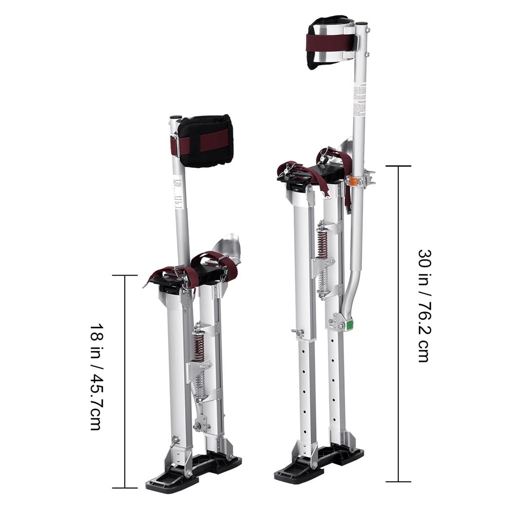 Sturdy Aluminum Alloy: Get ready for more support! VEVOR’s drywall stilts can easily hold up to 228 lbs. Made of robust aluminum alloy, featuring rust-proof, non-deformed, and optimal stability performance. Get ready to set the standard! In addition, you no longer have to worry about breakage due to its long service life. Set the Perfect Height: Are you tired of restrictions? Adjust to any challenge effortlessly! Through the screws, you get an easy height adjustment from 18 to 30 inches to meet various working needs. Additionally, thanks to the 3-position heel bracket design, our aluminum tool stilts accommodate most foot sizes ranging from 10.6 to 11.4 inches, ensuring comfortable uses for most users. Protective Knee Pad: The aluminum drywall stilts are upgraded with soft PVC pads, ensuring that the legs remain firmly secured without any discomfort. Also, the knee straps are durable and not easy to break, which is cost-effective and provides maximum comfort. Reliability and comfort are just a click away! Stability Above the Rest: In addition to solid nylon straps that ensure your security, the drywall walking stilts also adopt dual shock-absorbing springs to maintain your balance while you walk, so you can easily stand alone. The stilts will give you a leg up on your next big project; the bottom rubber bases increase the friction on the ground to avoid slipping and scratches. Versatile Uses: Join the thousands of satisfied users that are putting up drywall, painting, working in home decoration, tree pruning, electrical work, etc. Our adjustable stilt tool has a lightweight construction that is effortless to adjust and recommended for professionals. Take your work to the next level!