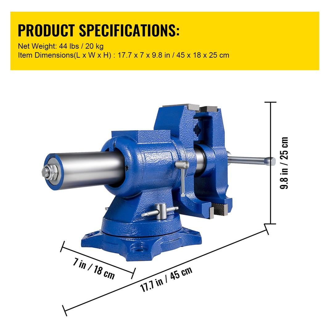 Product Description Swivel Multipurpose Bench Vise A 6-inch rotating bench vise is the ideal industry heavy-duty vise that prevents water, dirt & rust. It features with swivel head and base and can be used for home craftsmen, in the workshop, and even can be outdoor used. If the vise can be normally operated, it will be lifetime use. Specifications Material: Ductile Cast Iron Jaws Width: 6” / 152 mm Jaws Opening: 5” / 127 mm Throat Depth: 3” / 76 mm Clamping Force: 30 kN Hardness: 46 – 52 HRC Net Weight: 44 lbs / 20 kg Item Dimensions(L x W x H) : 17.7” x 7” x 9.8” / 45 x 18 x 25 cm Package Content 1 x Bench Vise 4 x Screws