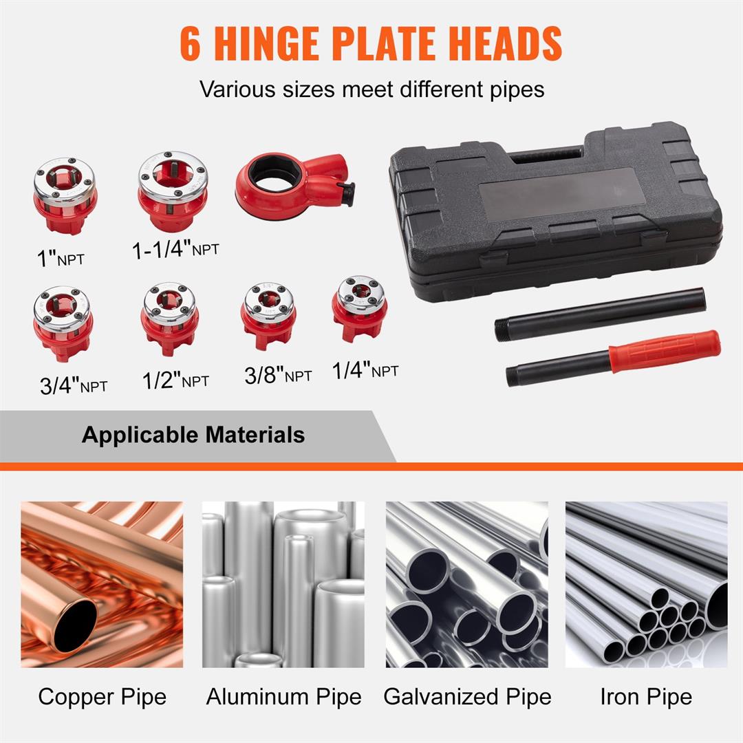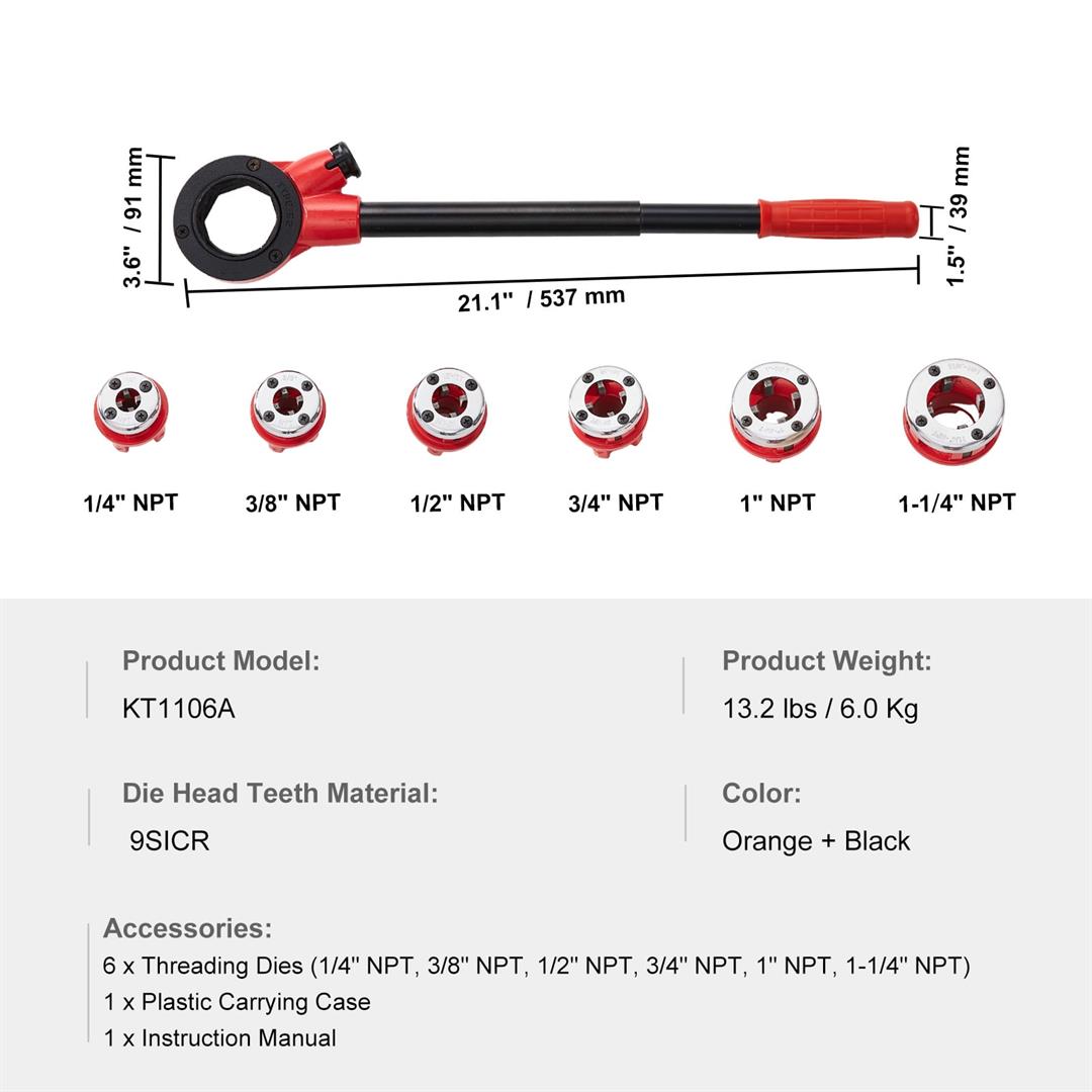 Product Description Ratchet Pipe Threader Kit Experience exceptional performance with VEVOR ratchet pipe threader kit. Featuring 6 threading hinge plate heads (1/4″ NPT-1-1/4″ NPT) to accommodates a wide range of tube sizes. 9SICR die head teeth can withstands heavy load without deformation, ensuring precise and non-slip threading. High Strength Made with commonly used low-alloy tool steel, the 9CR2 die head teeth boast high quenching permeability, hardness, and tempering stability Built to Last Compared to conventional 9CR2 material, it offers double the lifespan, providing you with a longer-lasting experience in professional or home projects. Comfortable Operation Our threading tool features a long ergonomic handle and a cushioned grip, delivers better grip and maximum torque. Easy to Operate With dedicated die heads for each pipe size and a manual ratchet mechanism, achieving clean threads is a breeze in just 4 simple steps. Wide Applications VEVOR manual ratchet pipe threader is highly suitable for the construction, plumbing, and equipment installation industries. 6PCS NPT Dies Featuring 6 threading hinge plate heads (1/4″ NPT – 1-1/4″ NPT) to accommodate a wide range of tube sizes. Specifications Item Mode Number: KT1106A 6 Threading Dies: 1/4″ NPT, 3/8″ NPT, 1/2″ NPT, 3/4″ NPT, 1″ NPT, 1-1/4″ NPT Die Head Teeth Material: 9SICR Product Weight: 13.2 lbs / 6.0 Kg Product Dimensions: 21.1″x3.6″x1.5″ / 537x91x39 mm Color: Orange + Black Package Content 6 x Threading Dies (1/4″ NPT – 1-1/4″ NPT) 1 x Handle 1 x Extension Bar 1 x Wrench Bracket 1 x Plastic Carrying Case 1 x Instruction Manual