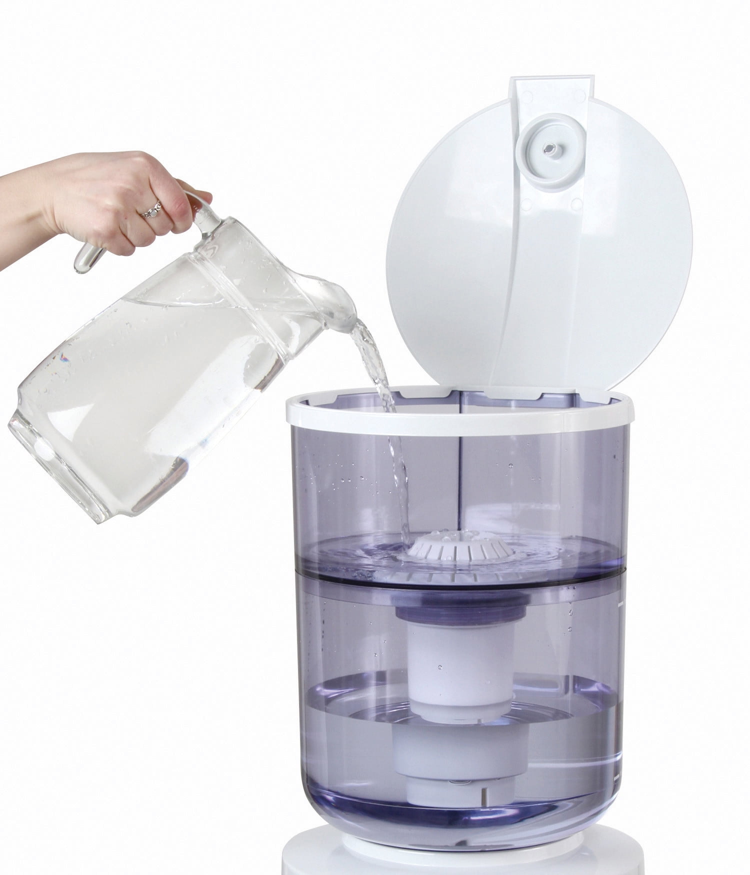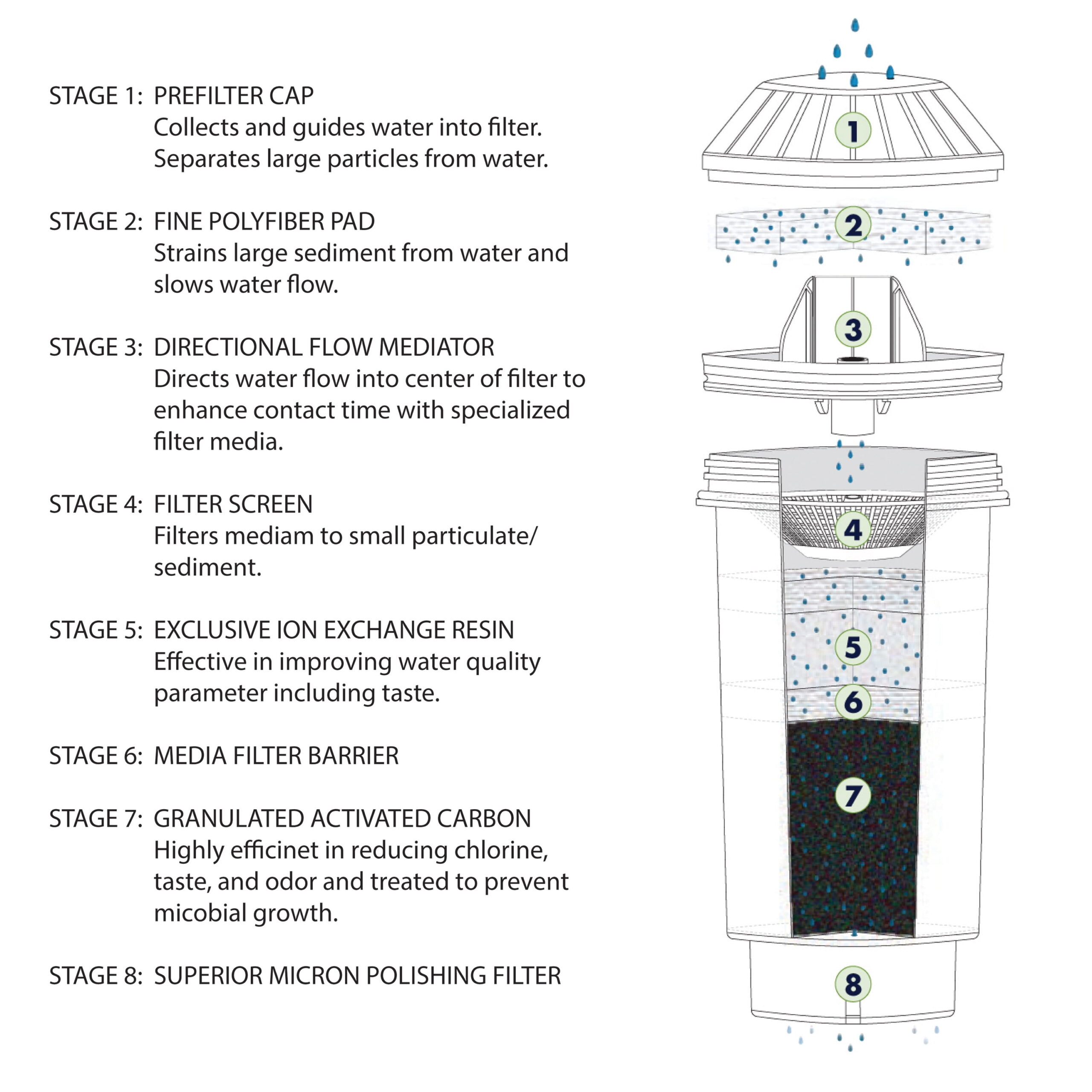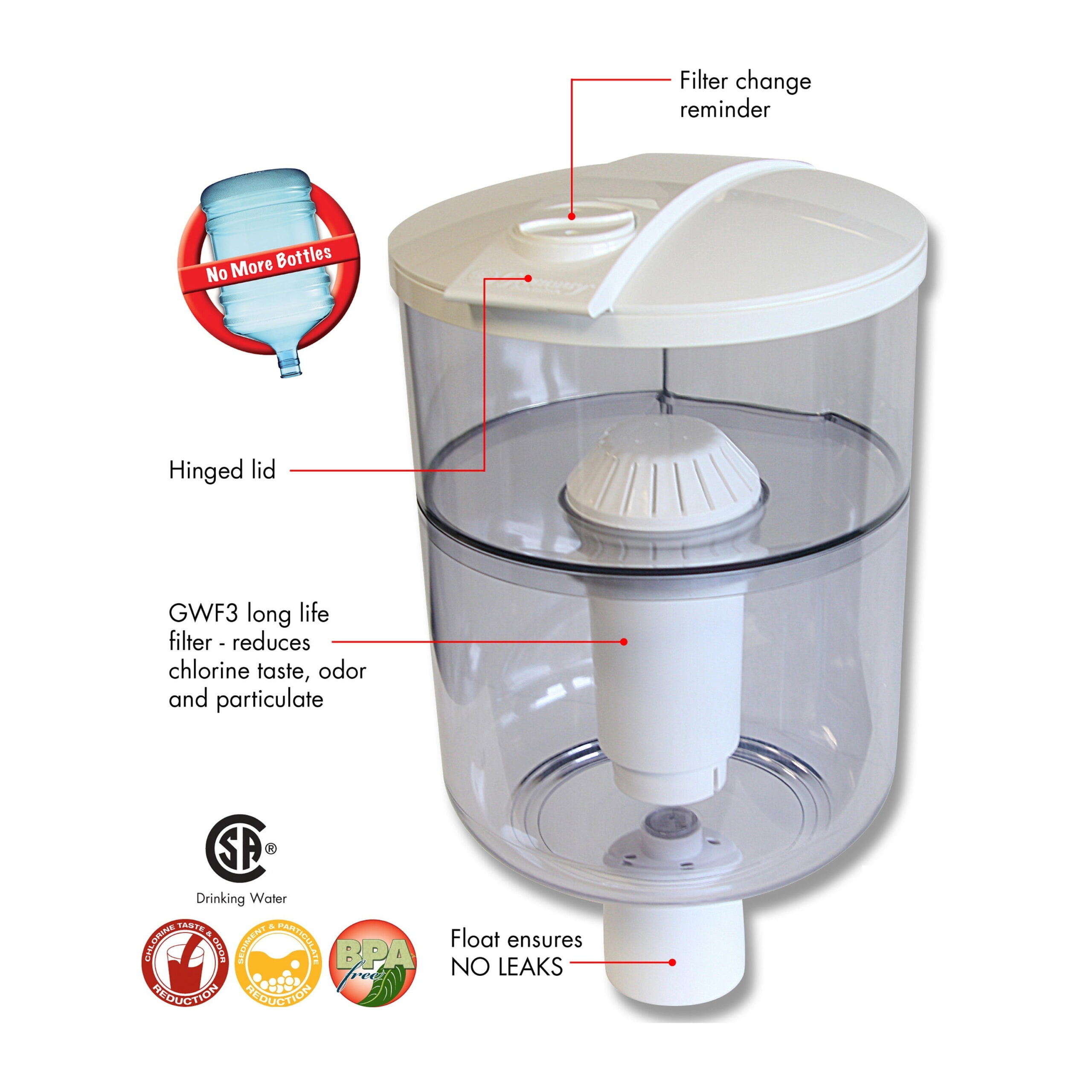 Vitapur GWF8 Water Filtration Jug System for Top-Load Water Dispensers, White. System includes one multi-stage filter that lasts for up to 6 months or 800L (42 five-gallon jugs of water) Environmentally friendly and BPA-free Manual date indicator lets you know when it’s time to change the filter Granulated active carbon filter Float design ensures no leaks Tested and certified by CSA to meet the requirements of NSF/ANSI Standard 42 and CSA B483.1 for the reduction of chlorine taste and odor Crisp, clean taste of filtered water without buying bottles Eliminate large water bottles, just fill from tap and enjoy using the hinged lid Use with GFW3 Long life filter- reduces chlorine taste, odor and particulate