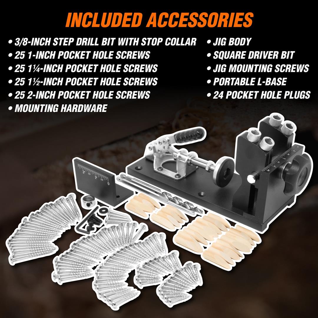 WEN Products Metal Pocket Hole Jig Kit with L-Base, Step Drill Bit, and Self-Tapping Screws Drill quick and accurate pocket hole joints; perfect for carpenters and woodworkers Adjustable toggle clamp accepts a range of thicknesses, including standard 2x4s Made from heavy-duty anodized aluminum with hardened steel drill guides Perfect for both portable and bench top applications Includes an L-base for tight spaces, mounting hardware for bench top installation, a 3/8-inch step drill bit with depth stop collar, 24 pocket hole plugs, 100 self-tapping screws, and a two-year warranty