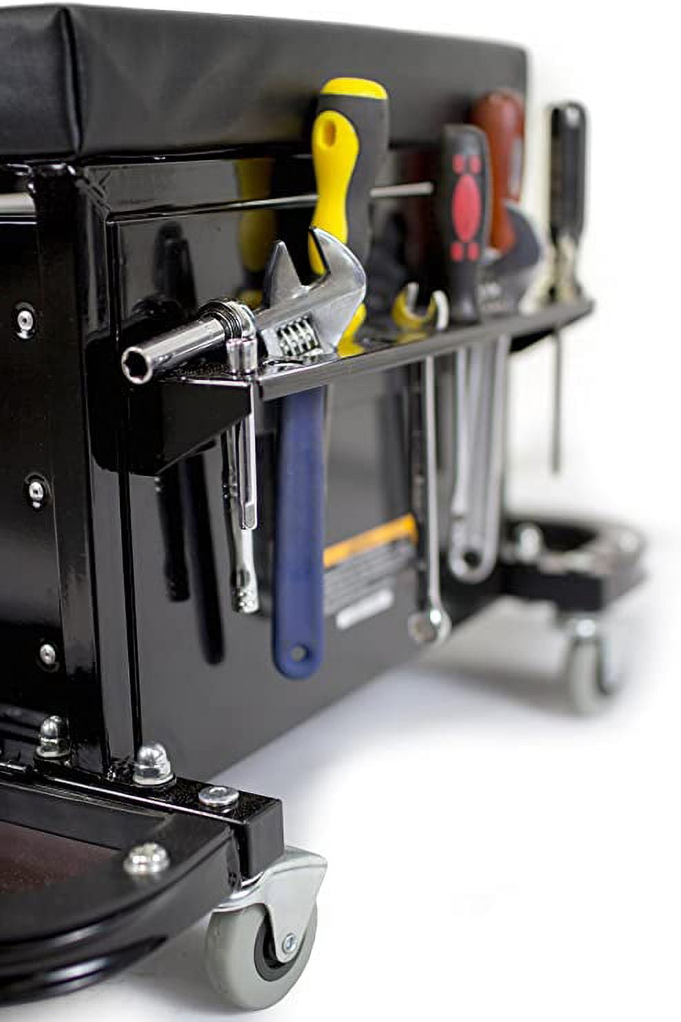 WEN,27.2 lb, 16.50″ Glider Rolling Tool Chest Black Thick and supportive vinyl-protected multi-layered padding maximizes protection and comfort Includes three storage drawers measuring 12-3/4 x 7-3/4 x 2-1/4 inches and 16 extra onboard storage slots 2.5-inch ball-bearing swivel casters provide easy movement in all directions Organize screws and bolts with the two foldable magnetic storage trays Holds up to 350 pounds of evenly distributed weight
