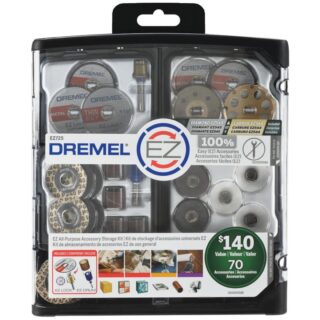 $38.99Add to cartMake home woodworking and repair easy with the 70-Piece EZ Dremel All-Purpose Accessory Kit. This comprehensive set transforms your Dremel rotary tool into a one-stop-shop, featuring just about everything you need for cutting, polishing, sanding and cleaning tasks. The Dremel accessory kit includes 70 pieces, including cutting wheels, sanding buffs, brands and discs as well as polishing cloths for clean, neat finishes. Eight storage bins and removable trays allow you to keep each tool and accessory safe and organized when not in use, and a clear lid makes it easy to identify and locate each item. The woodworking accessories kit can be stood upright on its own or hung on a wall by using a hook for compact, convenient storage when not in use. Dremel rotary tools are sold separately.