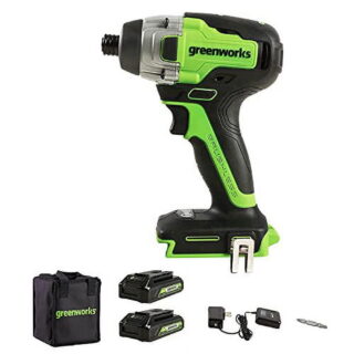 $53.89Add to cartThis versatile, powerful, and compact Greenworks 24V 1/4-inch Impact Driver was designed to be strong enough to get the job done, yet small enough to get into narrow spaces. Its motor has been engineered with efficiency in mind, so it wastes little battery while still doling out 4,000 IPM for effortless driving. Control the speed by pulling harder on the trigger, so you can decide exactly how much force each fastener requires. Its handle is designed to be used for long stretches with its soft, over mold construction. And the LED light prevents you from ever having to work in the dark. The 1/4 in. hex chuck accepts all universal brands of bits. 24V battery and charger sold separately and is backed by a 3-year warranty.